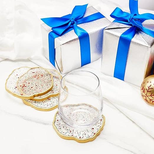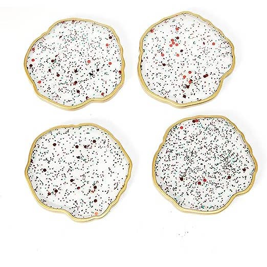 Each Coaster is handmade with epoxy resin and features it's own unique pattern featuring the red and green confetti. Each coaster measures approximately 4" in diameter.